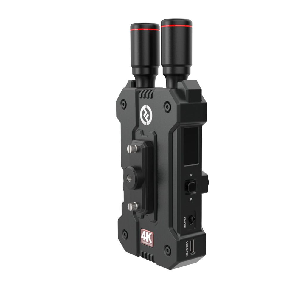 Mars 4K送信機(TX)は、4K UHD映像(30fps)のワイヤレス伝送に対応し、送信と受信機やアプリによる最大3端末までの同時モニタリングが可能。150m(450ft)までの見通し伝送距離を実現し、超低遅延(約0.06 秒)での安定した映像送信をサポート。HDMIとSDIの両入力に対応し、用途に応じた柔軟な接続が可能。カラーLCDとスイッチ式メニューによる直観操作を備え、DSLR・プロカメラ・ドローンなど幅広い撮影機材で活躍。